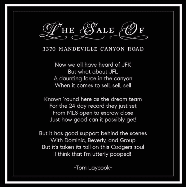 Nothing like a good poem to celebrate a momentous occasion!! This one was read to Fran Flanagan Group at a dinner with Tom Laycock, the author, and owner of 3730 Mandeville Canyon.