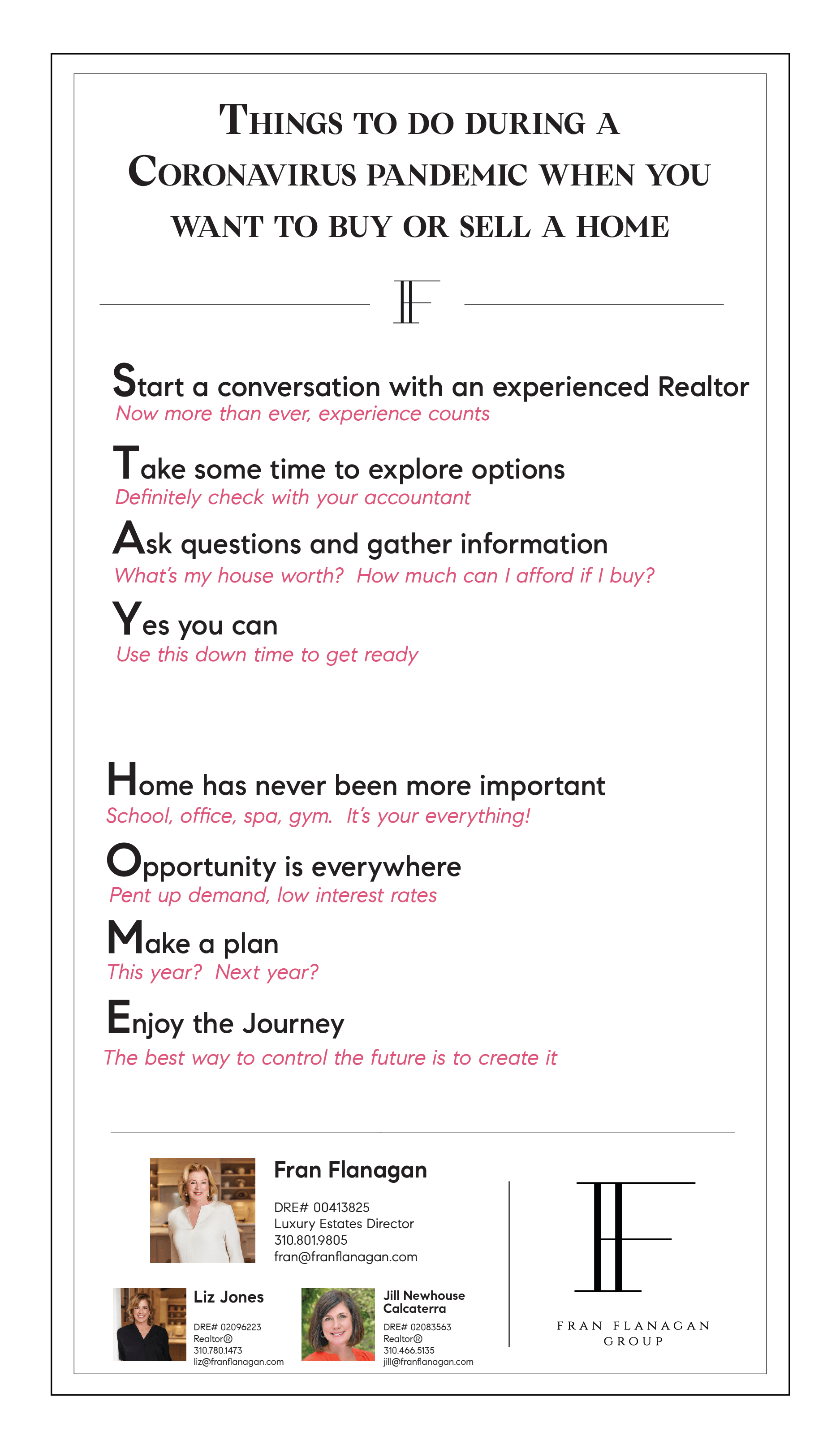 We follow our market data obsessively and believe that we will see a strong, expedient recovery when this is all behind us. With optimism and professionalism, Fran Flanagan Group is, like we always have been, here for you.